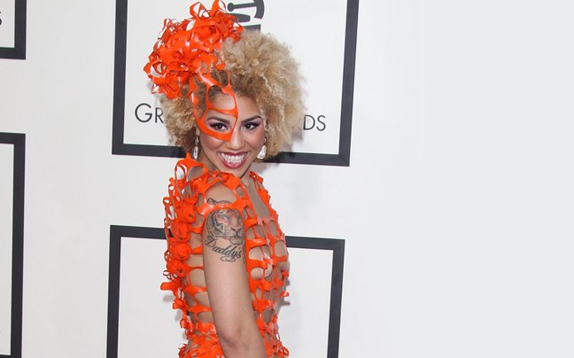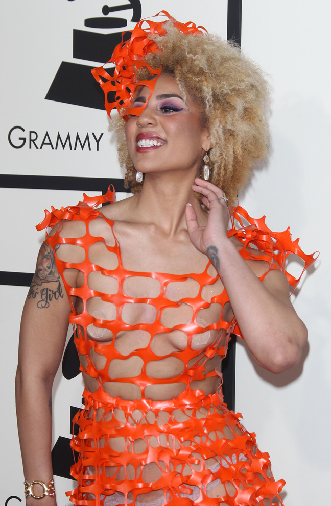 Η τραγουδίστρια και μοντέλο Joy Villa που επέλεξε για τη βραδιά ένα φόρεμα φτιαγμένο από πλαστικό για φράχτες χρώματος πορτοκαλί.