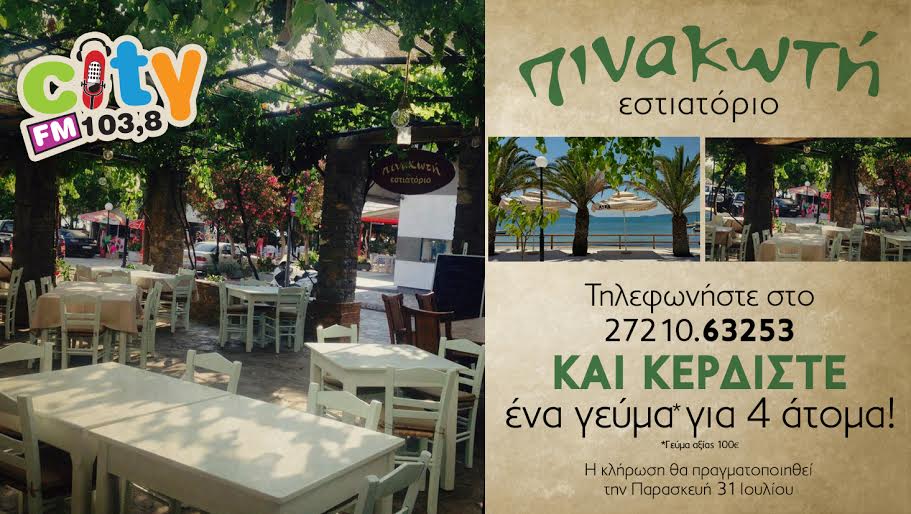 Συντονιστείτε στον City FM 103,8 και κερδίστε ένα τραπέζι για 4 άτομα αξίας έως 100 ευρώ, στην ταβέρνα Πινακωτή που βρίσκεται στην φανταστική Γιάλοβα!