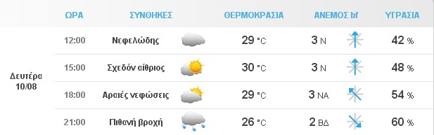 Άστατο καιρό με σποραδικές βροχές και καταιγίδες κυρίως μετά το μεσημέρι στα ηπειρωτικά τμήματα της χώρας, στο Κεντρικό Ιόνιο, στα ορεινά της Κρήτης και πιθανόν σε νησιωτικές περιοχές του Ανατολικού Αιγαίου, περιμένουμε τη Δευτέρα 10 Αυγούστου 2015. Τα φαινόμενα στα ηπειρωτικά θα είναι εντονότερα και ιδιαίτερα στα ορεινά της Πελοποννήσου, της Στερεάς, της Δυτικής Θεσσαλίας και την Ηπείρου και θα συνοδεύονται από χαλαζοπτώσεις και πολύ ενισχυμένους ανέμους.