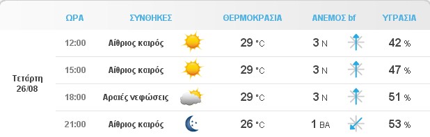 Ηλιοφάνεια στο μεγαλύτερο μέρος της χώρας, μικρή περαιτέρω άνοδο της θερμοκρασίας στα δυτικά και ενισχυμένους βοριάδες στο Αιγαίο αναμένουμε την Τετάρτη 26 Αυγούστου. Αυξημένες νεφώσεις με πιθανότητα για τοπικές μπόρες περιμένουμε τις απογευματινές ώρες σε ορεινές περιοχές της βορειοδυτικής Ελλάδας.