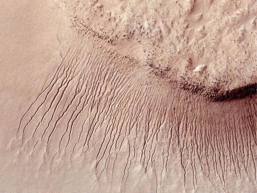 Οι ροές του αλμυρού νερού αφήνουν σκούρους λεκέδες και ραβδώσεις στο έδαφος του Άρη που φτάνουν τα εκατοντάδες μέτρα πριν στεγνώσουν το φθινόπωρο με την πτώση θερμοκρασίας επιφάνειας.