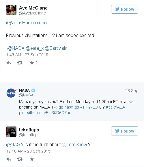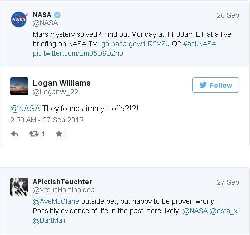 Βάσει του πάνελ, κάποιοι υποψιάζονται ότι η αποκάλυψη θα έχει να κάνει με την εύρεση νερού στον Αρη, καθώς οι Ojha, Wilhelm και McEwen είναι ανάμεσα στους επιστήμονές που υποστήριξαν με εργασίες τους ότι οι εικόνες που στάλθηκαν από τον πλανήτη δείχνουν νερό να ρέει στην επιφάνεια του.