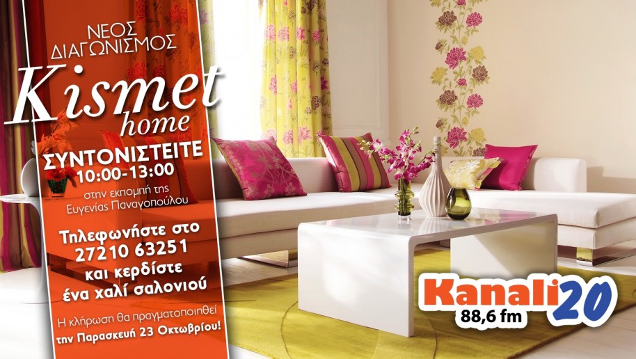 Το Κανάλι 20 88,6 ντύνει το σπίτι σας με τα πιο ξεχωριστά χαλιά δώρο από το Kismet Home! Συντονιστείτε καθημερινά 10:00 – 13:00 στην εκπομπή της Ευγενίας Παναγοπούλου, τηλεφωνήστε στο 2721063251 και δηλώστε συμμετοχή στον διαγωνισμό. Ένας τυχερός ακροατής θα κερδίσει ένα χαλί σαλονιού. Η κλήρωση θα γίνει την Παρασκευή 23 Οκτωβρίου.