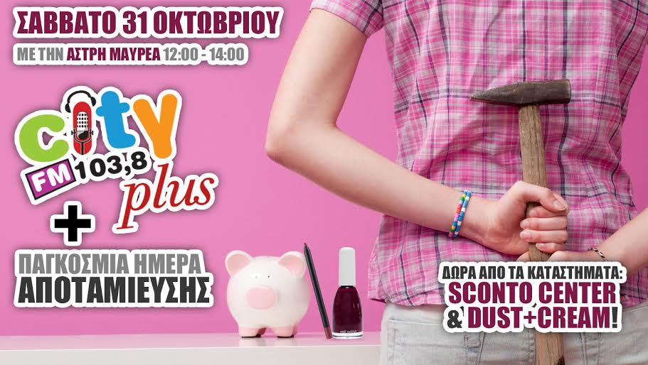 Το Σάββατο 31 Οκτωβρίου συντονιστείτε στην εκπομπή City FM 103,8 Plus με την Άστρη Μαυρέα από τις 12:00 – 14:00, διασκεδάστε με τα πιο ωραία τραγούδια και μπείτε στην κλήρωση για να κερδίσετε 1 υπέροχο κουμπαρά από το SCONTO CENTER και ένα βερνίκι νυχιών και ένα μολύβι χειλιών σε μπορντό απόχρωση το DUST and CREAM!!!