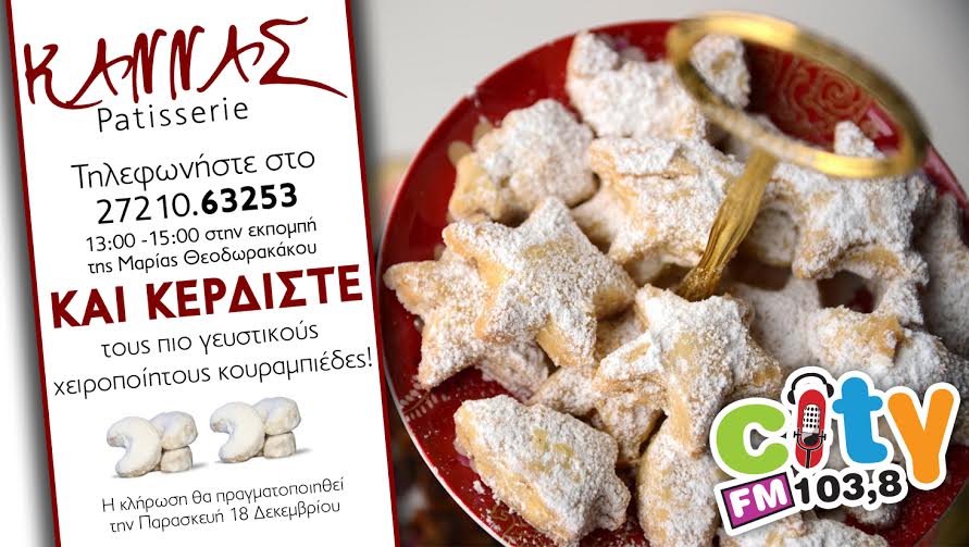 Συντονιστείτε καθημερινά 13:00-15:00 στον City Fm 103.8 , στην εκπομπή της Μαρίας Θεοδωρακάκου και δηλώστε συμμετοχή για να κερδίσετε 1 κιλό χειροποίητους κουραμπιέδες από τα ζαχαροπλαστεία ΚαννάςPatisserie για εσάς και τους καλεσμένους σας στο Χριστουγεννιάτικο τραπέζι.