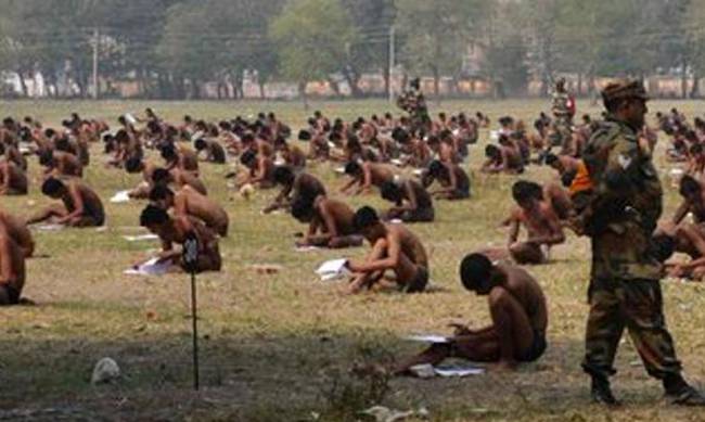 Η Indian Express δημοσίευσε μάλιστα μια φωτογραφία (κεντρική) στην οποία δεκάδες άνδρες, μόνο με το σλιπάκι τους, είναι καθισμένοι στο έδαφος, μπροστά σε έναν ένστολο επιτηρητή. Πολλοί από αυτούς γράφουν, στις κόλλες που ακουμπούν στα πόδια τους.