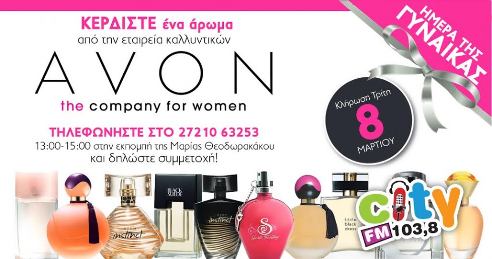 Την Τρίτη 8 Μαρτίου, είναι η Παγκόσμια Ημέρα της Γυναίκας, γι’ αυτό ο City FM 103,8 και η αγαπημένη μας εταιρεία καλλυντικών προϊόντων AVON, χαρίζουν σε μια τυχερή ακροάτρια ένα συναρπαστικό άρωμα δώρο! Τηλεφωνήστε στο 2721063253 και δηλώστε συμμετοχή 13:00 – 15:00 στην εκπομπή που επιμελείται και παρουσιάζει η Μαρία Θεοδωρακάκου!