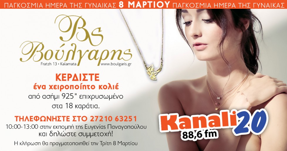Με αφορμή αυτή τη γιορτή, το Κανάλι 20 88,6 και το κατάστημα χειροποίητων κοσμημάτων & ρολογιών ΒΟΥΛΓΑΡΗΣ, χαρίζουν σε μια τυχερή ακροάτρια ένα υπέροχο κόσμημα δώρο, ένα χειροποίητο κολιέ από ασήμι 925″ επιχρυσωμένο στα 18 καράτια!