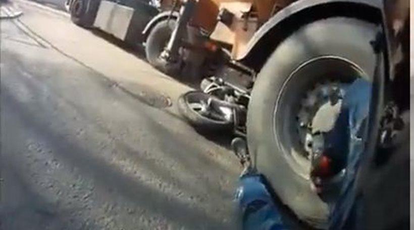 video Βίντεο σοκ θαύμα Μοτοσικλετιστής πέφτει φορτηγό