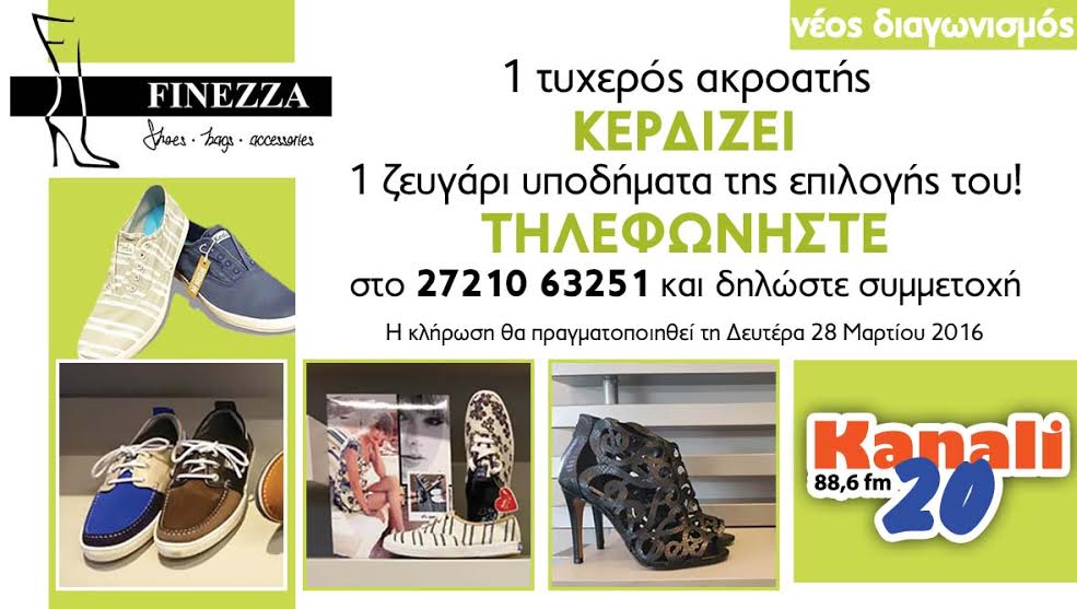Το Κανάλι 20 88,6 και το κατάστημα υποδημάτων FINEZZA, κάνουν δώρο σε έναν τυχερό ακροατή 1 ζευγάρι υποδήματα της επιλογής του!