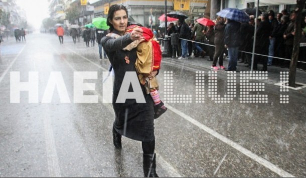 ΦΩΤΟ από ilialive.grΗ σύζυγός του σαφώς συναισθηματικά φορτισμένη και από το γεγονός της απουσίας του άντρα της, παρέλασε μόνη στη βροχή με την κόρη της αγκαλιά, την ώρα που κανείς άλλος δεν έκανε παρέλαση στην πόλη (θυμηθείτε εδώ)