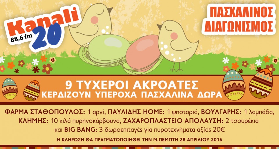 NEOΣ ΔΙΑΓΩΝΙΣΜΟΣ Κερδίστε. εννιά. πασχαλινά δώρα. Κανάλι 20 88.6 κλήρωση