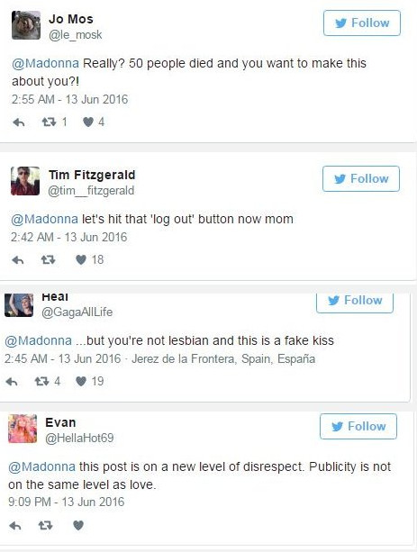 «Αλήθεια; 50 άνθρωποι έχασαν τη ζωή τους και εσύ ασχολείσαι με τον εαυτό σου;» διερωτήθηκε ένας χρήστης. «Δεν είσαι λεσβία και αυτό είναι ένα ψεύτικο φιλί» σχολίασε ένας άλλος. «Αυτή η ανάρτηση δείχνει ένα άλλο επίπεδο ασέβειας. Η δημοσιότητα δεν είναι το ίδιο με την αγάπη» έγραψε μια θαυμάστρια.