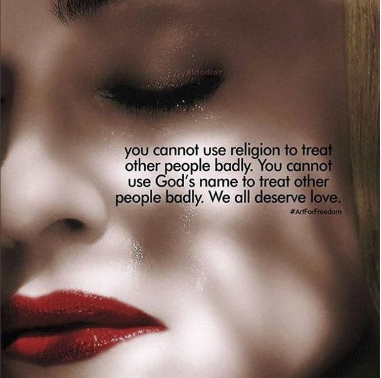«Δεν μπορείς να χρησιμοποιείς τη θρησκεία ως δικαιολογία για να συμπεριφέρεσαι άσχημα σε άλλους ανθρώπους. Δεν μπορείς να συμπεριφέρεσαι άσχημα με πρόσχημα τον Θεό. Ολοι αξίζουμε την αγάπη» έγραφε η φωτογραφία που απεικόνιζε την ίδια και αναρτήθηκε το βράδυ της Τρίτης.