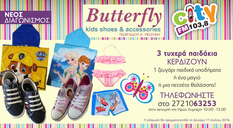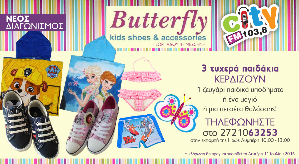 Το κατάστημα παιδικών υποδημάτων Butterfly και ο City FM 103,8 εύχονται καλό καλοκαίρι σε όλα τα παιδιά, με έναν super διαγωνισμό!