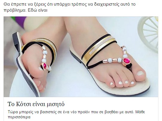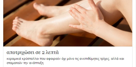 Έχοντας αυτό τα δεδομένα στο μυαλό σας, λοιπόν, θα θέλαμε να σας παρουσιάσουμε τέσσερις διαφημίσεις που έχουν περάσει κατά καιρούς και σε ανυποψίαστο χρόνο από το newsfeed μας στο Facebook. Πρόκειται για τέσσερις διαφημίσεις που απευθύνονται αποκλειστικά σε γυναικείο κοινό και αφορούν τρία «καυτά» θέματα που ταλαιπωρούν μια γυναίκα: κυτταρίτιδα, τρίχες, περιποίηση άκρων.