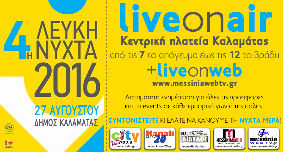 Στα μικρόφωνα… οι παραγωγοί των ραδιοφώνων City FM 103,8 και Κανάλι 20 88,6 με ασταμάτητη ενημέρωση για όλα τα events της βραδιάς στην πόλη, οι επιχειρηματίες για τις super προσφορές τους και φυσικά όλοι εσείς! Συντονιστείτε στις αγαπημένες σας ραδιοφωνικές συχνότητες και μη χάσετε ούτε στιγμή από την 4η Λευκή Νύχτα Καλαμάτας, μέσα από μια συνεχή, ζωντανή ραδιοφωνική ροή από την κεντρική πλατεία και τα στούντιο, με πολλές ζωντανές συνδέσεις με τους επιχειρηματίες, τους καταναλωτές αλλά και με όλους τους κοινωνικούς, πολιτιστικούς και αθλητικούς φορείς που θα συμμετέχουν στις εκδηλώσεις σε κάθε γωνιά της πόλης.