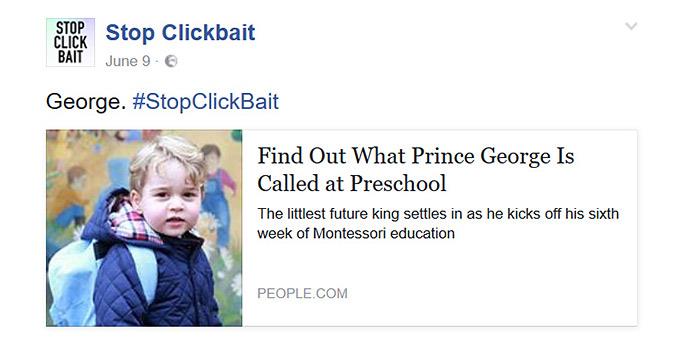 Τι κάνουν; Ποστάρουν τις πιο viral «ειδήσεις» της ημέρας, με το spoiler (το περιεχόμενο της είδησης δηλαδή) στη λεζάντα, και το hashtag #StopClickbait. Το αποτέλεσμα είναι συχνά ξεκαρδιστικό, όπως στα παραδείγματα που ακολουθούν.