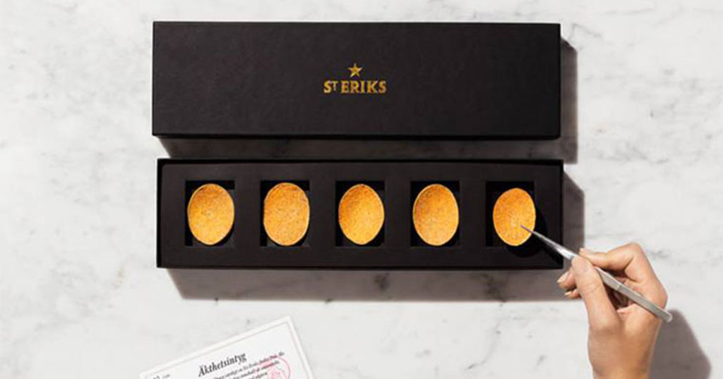 Ονομάζονται St Eriks Chips και είναι τα πιο ακριβά πατατάκια στον κόσμο! Τα πολυτελή αυτά τσιπς πωλούνται σε μια όμορφη συσκευασία που περιέχει 5 μόλις τεμάχια, στην τιμή των 56 δολαρίων (περίπου 50 ευρώ). Υπεύθυνη για τη δημιουργία τους είναι η εταιρεία Abby Priest…., ενώ προορίζονται για να συνοδεύουν την μπύρα της φημισμένης St Eriks Brewery. Και μπορεί η τιμή να φαίνεται εξωφρενική, τα έσοδα όμως από τις πωλήσεις θα δοθούν σε φιλανθρωπίες. Μάλλον αυτός είναι και ο λόγος που οι συσκευασίες των St Eriks Chips έχουν ήδη ξεπουλήσει!