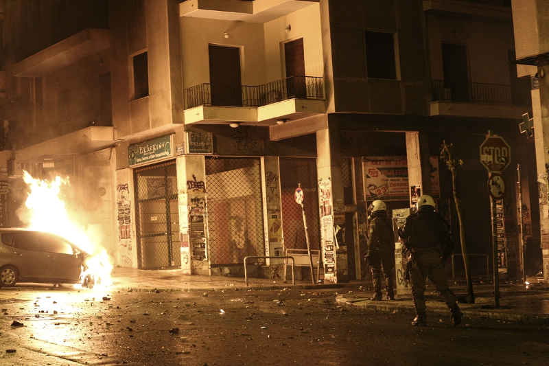 Οι αντιεξουσιαστές έβαλαν φωτιά σε δύο αυτοκίνητα τα οποία μετέτρεψαν σε οδοφράγματα στην συμβολή Μπενάκη και Σόλωνος ενώ ξεκίνησε πετροπόλεμος με τα ΜΑΤ στη Στουρνάρη και τα γύρω στενά. Στη συνέχεια έστησαν οδοφράγματα σε διάφορους δρόμους των Εξαρχείων, με επίκεντρο την οδό Σολωμού, έκαναν επιθέσεις κατά των αστυνομικών δυνάμεων με πέτρες, μολότοφ, ενώ τα ΜΑΤ απαντούσαν με χημικά και χειροβομβίδες κρότου-λάμψης.