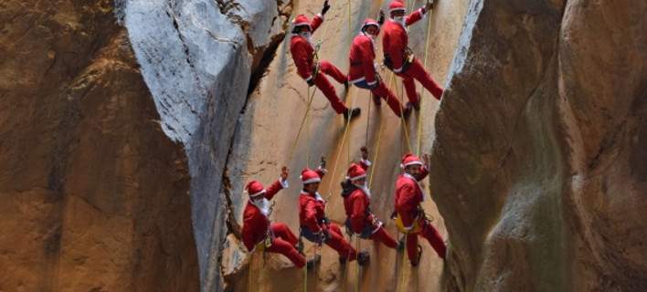 Με Αγιοβασίληδες γέμισε το άβατο φαράγγι του Καβουσίου στο Ηράκλειο της Κρήτης στην Χριστουγεννιάτικη επετειακή κατάβαση που διοργανώθηκε από τον Παγκρήτιος Όμιλος Διάσχισης & Εξερεύνησης Φαραγγιών.