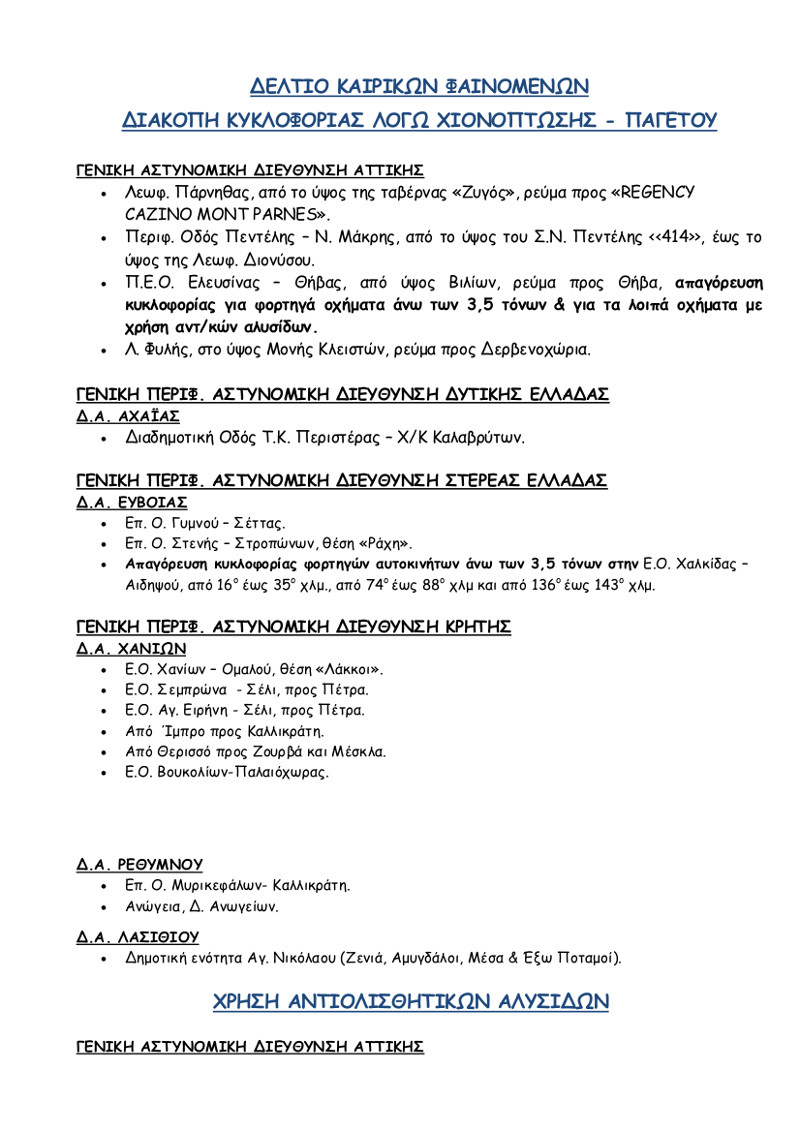 Στις 7:30 το πρωί η Ελληνική Αστυνομία έδωσε στη δημοσιότητα τη λίστα με τις «επικίνδυνες» λόγω του χιονιά περιοχές ενημερώνοντας τους οδηγούς σε ποια σημεία του οδικού δικτύου είναι κλειστά και σε ποια χρειάζονται αντιολισθητικές αλυσίδες.