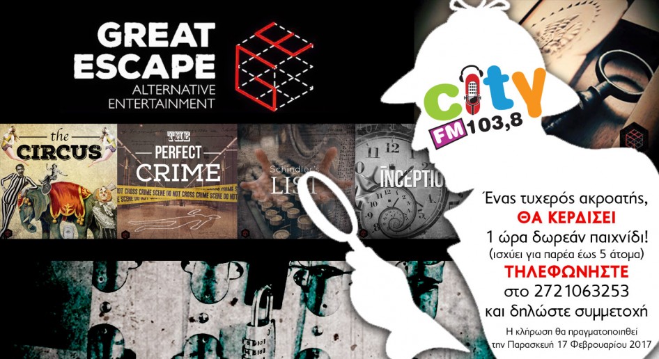 Την Παρασκευή 17 Φεβρουαρίου, 1 τυχερός ακροατής του City FM 103,8 θα κερδίσει 1 ώρα δωρεάν παιχνίδι στο Great Escape, γι αυτόν και την παρέα του, έως 5 άτομα!