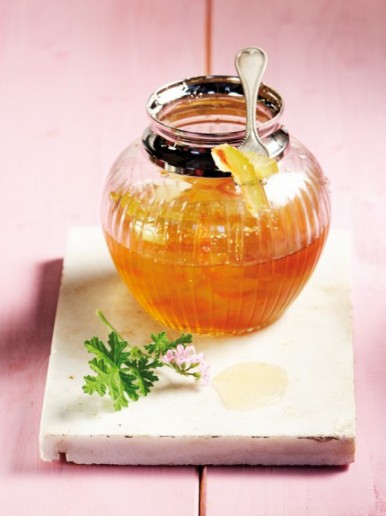 Προσθέτετε το μέλι και ξαναβράζετε μέχρι να δέσει το σιρόπι, ξαφρίζοντας όταν χρειάζεται. Προς το τέλος ρίχνετε δύο κουταλιές σούπας χυμό λεμονιού και τα φύλλα της αρμπαρόριζας.
