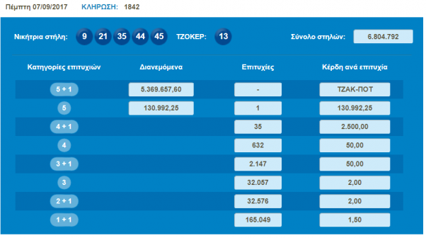 Οι τυχεροί αριθμοί της αποψινής κλήρωσης(1842) είναι: 9,21,35,44,45 με τζόκερ τον αριθμό 13