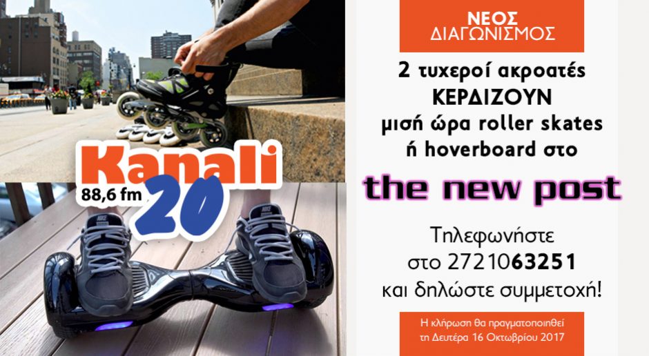 Δυο τυχεροί ακροατές θα κερδίσουν από μισή ώρα χόβερμπορντ ή πατίνια (roller skates) στη φανταστική πίστα του New Post!