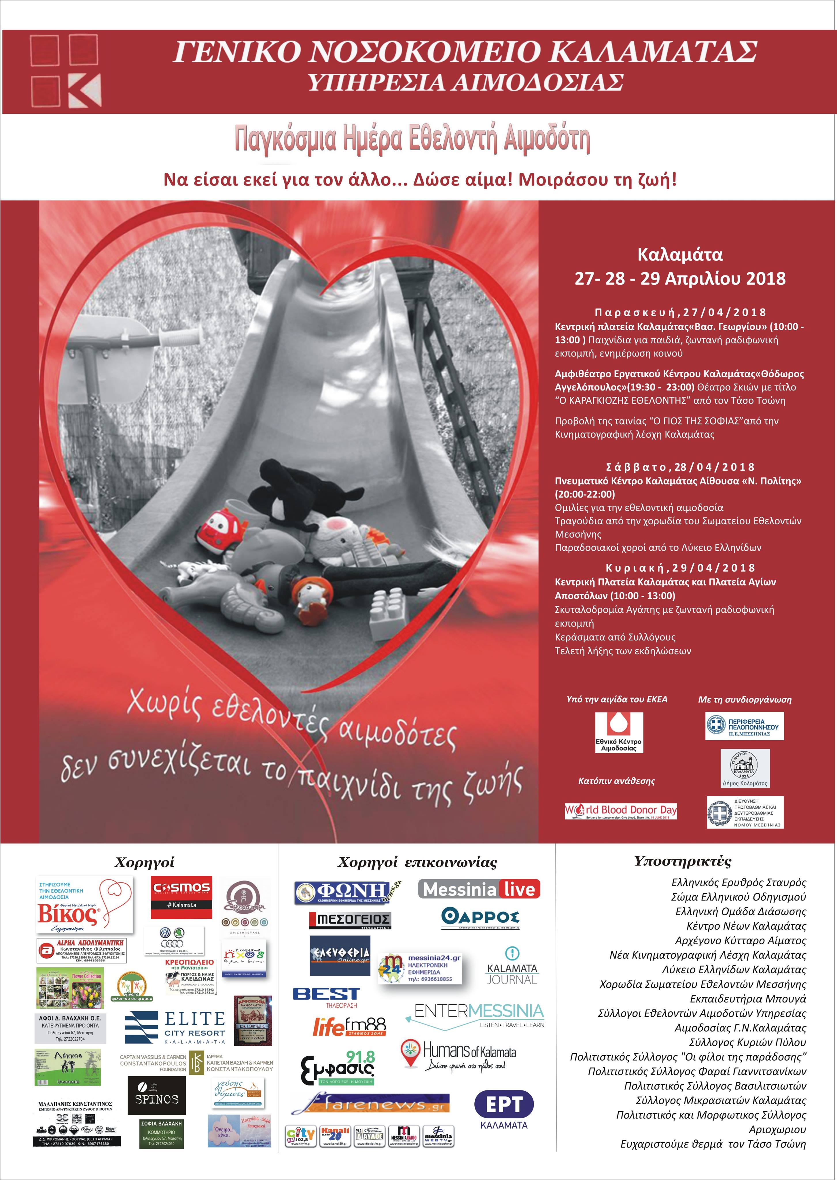Αναλυτικά, το πρόγραμμα των εκδηλώσεων που θα γίνουν στην Καλαμάτα το τριήμερο 27, 28 και 29 Απριλίου για την Παγκόσμια Ημέρα Εθελοντή Αιμοδότη, προβλέπει: