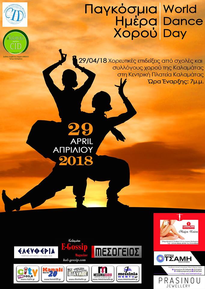 Στο πλαίσιο της Παγκόσμιας Ημέρας Χορού, την Κυριακή 29 Απριλίου στις 7 το απόγευμα, θα πραγματοποιηθούν χορευτικές επιδείξεις από Σχολές και Συλλόγους Χορού της Καλαμάτας στην Κεντρική πλατεία της πόλης!
