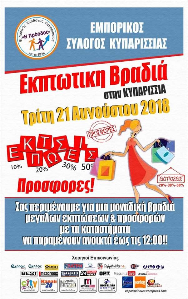 Ο Εμπορικός Σύλλογος Κυπαρισσίας, διοργανώνει Εκπτωτική Βραδιά στην Κυπαρισσία την Τρίτη 21 Αυγούστου!