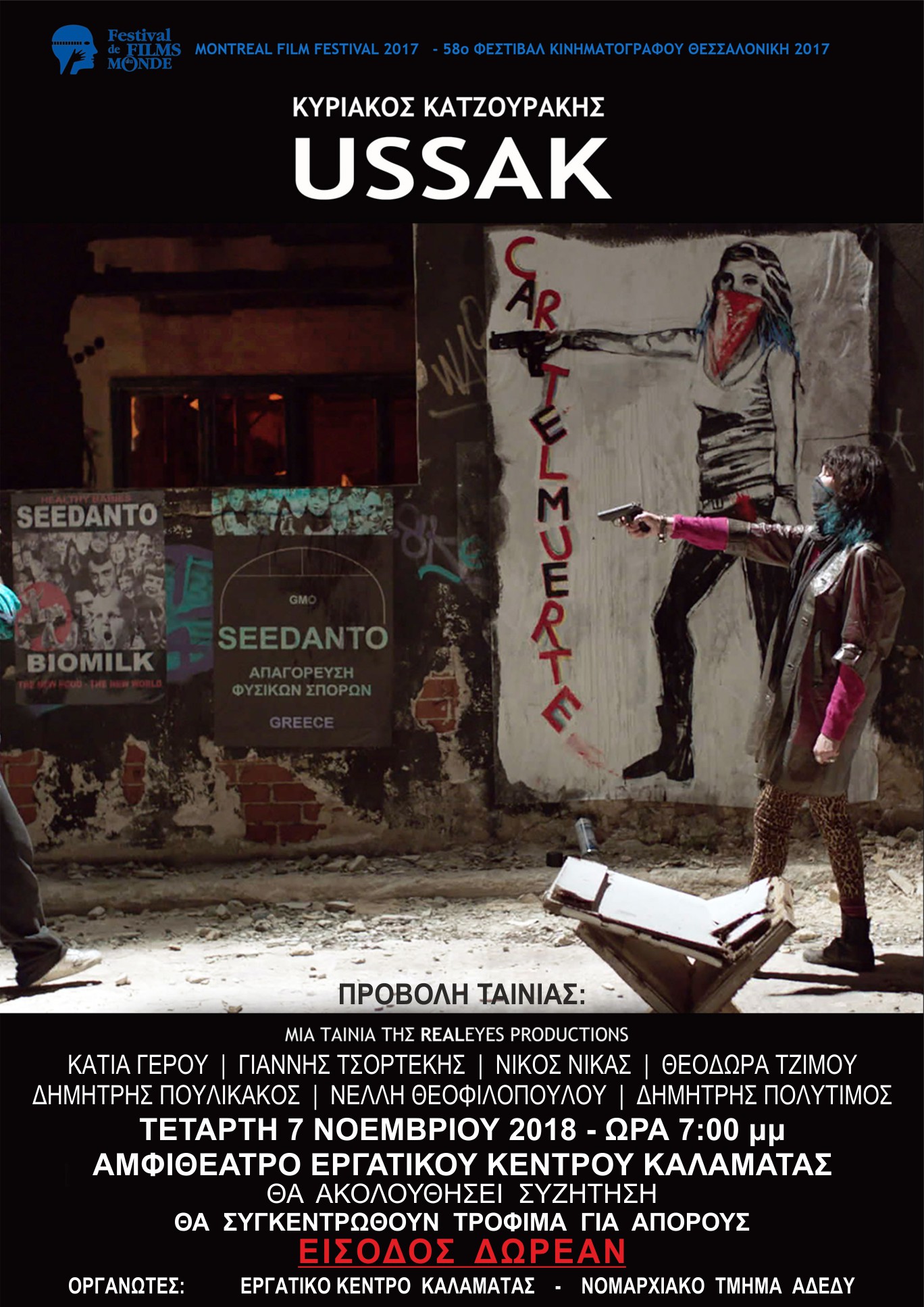 Η ταινία USSAK που γυρίστηκε και στη Μεσσηνία σε σκηνοθεσία Κυριάκου Κατζουράκη θα προβληθεί με δωρεάν είσοδο στο αμφιθέατρο του Εργατικού Κέντρου Καλαμάτας τη Τετάρτη 7 Νοεμβρίου στις 07:00 μ.μ. Οι διοργανωτές αντί αντιτίμου για την προβολή καλούν όλους στην συνεισφορά τροφίμων για άπορους.
