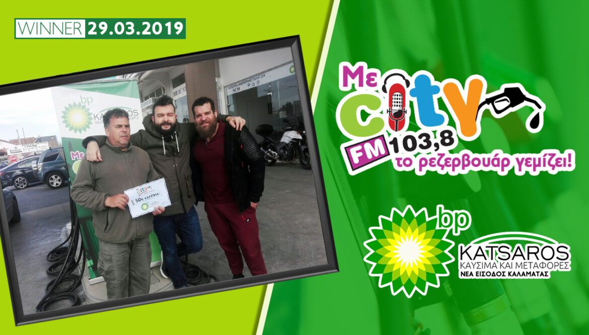 Συντονιστείτε όλοι στο City FM 103,8 όπου κι αν βρίσκεστε γιατί μπορεί να είστε εσείς ο τυχερός ακροατής που θα κερδίσει αυτή την εβδομάδα 50€ καύσιμα για το αυτοκίνητό του, από το πρατήριο BP ΚΑΤΣΑΡΟΣ στη Νέα Είσοδο Καλαμάτας, με την πιο απλή διαδικασία! Απλά με μια βόλτα! Συντονιστείτε στο σπίτι, στο γραφείο, στο αυτοκίνητο, γιατί σε όποιο σημείο της Καλαμάτας κι αν βρίσκεστε σε 15 λεπτά, μπορείτε να φτάσετε εσείς ΠΡΩΤΟΣ στο BP Κατσαρός στη Νέα Είσοδο Καλαμάτας! Μια φορά την εβδομάδα ¨Με City το ρεζερβουάρ γεμίζει¨!!!