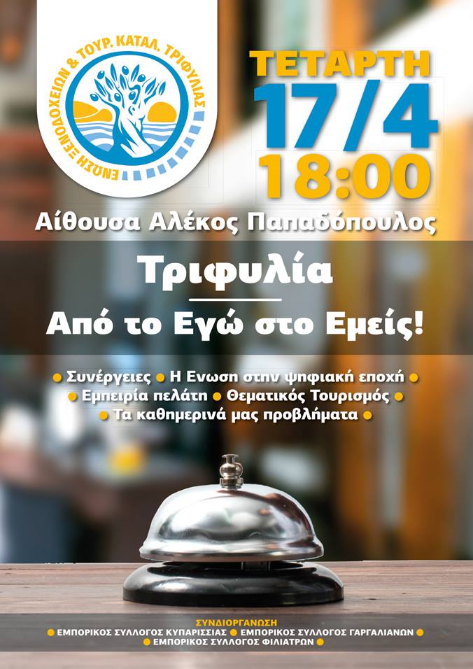 Η Ένωση Ξενοδόχων & Ιδιοκτήτων Τουριστικών Καταλυμάτων Τριφυλίας ως οργανωτής και ο Εμπορικός Σύλλογος Κυπαρισσίας, ο Εμπορικός και Βιοτεχνικός Σύλλογος Γαργαλιάνων και ο Εμπορικός Σύλλογος Φιλιατρών ως συνδιοργανωτές, διοργανώνουν ημερίδα με θέμα «Τριφυλία, από το Εγώ στο Εμείς», την Τετάρτη 17 Απριλίου και ώρα 18:00 μ.μ. στην αίθουσα Αλέκος Παπαδόπουλος στην Κυπαρισσία. Θα ήταν τιμή και χαρά για εμάς να παραβρεθείτε και να συμμετέχετε ενεργά στην ενημερωτική μας εκδήλωση.