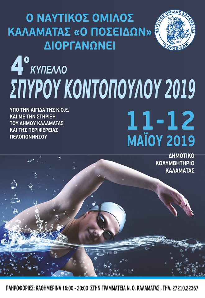 Ο Ναυτικός Όμιλος Καλαμάτας ¨Ο ΠΟΣΕΙΔΩΝ¨ διοργανώνει το 4ο κύπελλο ¨Σπύρος Κοντόπουλος 2019¨ το Σαββατοκύριακο 11 και 12 Μαΐου 2019 στο Δημοτικό Κολυμβητήριο Καλαμάτας.