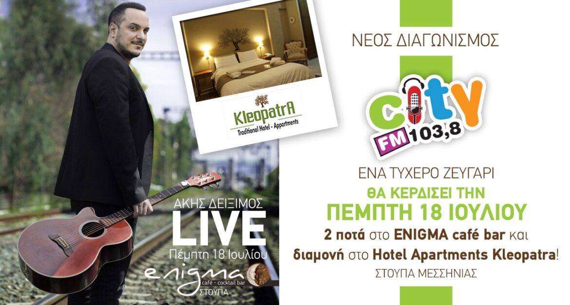 Το βράδυ της Πέμπτης 18 Ιουλίου, ένα τυχερό ζευγάρι, θα πιει 2 ποτά δώρο στο ENIGMA café bar στη Στούπα και θα κοιμηθεί στη σουίτα τουHotel Apartments Kleopatra!