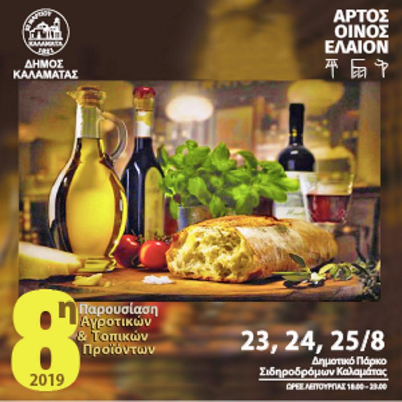 Τα ποιοτικά αγροδιατροφικά μας προϊόντα και ο ελληνικός λαϊκός πολιτισμός θα βρεθούν στο επίκεντρο της 8ης Παρουσίασης Αγροτικών και Τοπικών Προϊόντων «Άρτος – Οίνος – Έλαιον» (2019). Την Παρουσίαση διοργανώνει ο Δήμος Καλαμάτας και θα διεξαχθεί μεταξύ της Παρασκευής 23 και της Κυριακής 25 Αυγούστου 2019. Το Δημοτικό Πάρκο Σιδηροδρόμων θα υποδεχθεί πλήθος εκδηλώσεων και παραγωγούς προϊόντων σε 44 περίπτερα, που θα προβάλουν τα αγαθά του μόχθου τους. Θα πραγματοποιηθούν, μεταξύ άλλων, γευσιγνωσίες και παρουσιάσεις μαγειρικής με τη Μαρία Εκμεκτσίογλου και με την υποστήριξη της Λέσχης Αρχιμαγείρων Ελλάδος.