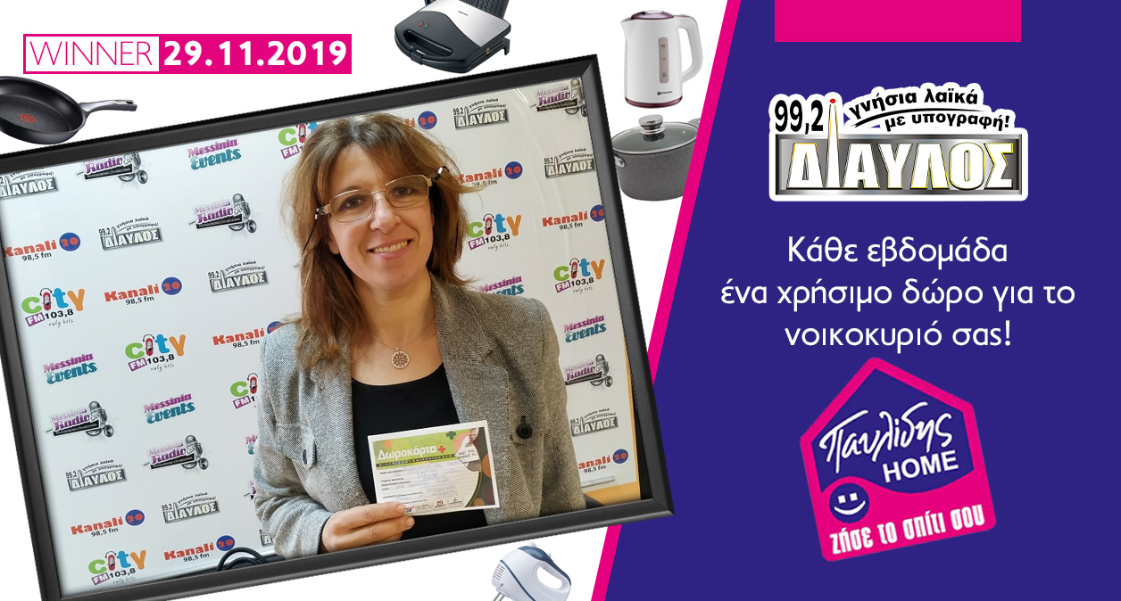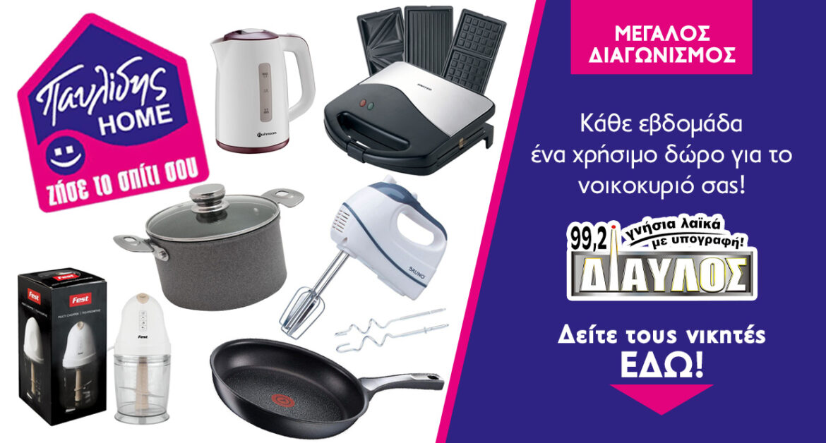 Αυτή τη σεζόν στο Δίαυλο 99,2 το έβαλαν σκοπό να σας νοικοκυρέψουν όλους! Κάθε εβδομάδα, σας έχουν και ένα χρήσιμο δώρο για το νοικοκυριό σας, από το αγαπημένο κατάστημα οικιακών ειδών ΠΑΥΛΙΔΗΣ HOME, Αθηνών 171 στην Καλαμάτα! Μια σειρά 11 υπέροχων δώρων για το σπίτι σας, σας περιμένουν να τα διεκδικήσετε τις επόμενες 11 εβδομάδες, γι αυτό συντονιστείτε στο Δίαυλο 99,2, μάθετε το ΔΩΡΟ της εβδομάδας και δηλώστε συμμετοχή στο 2721063252 όταν σας ζητηθεί!