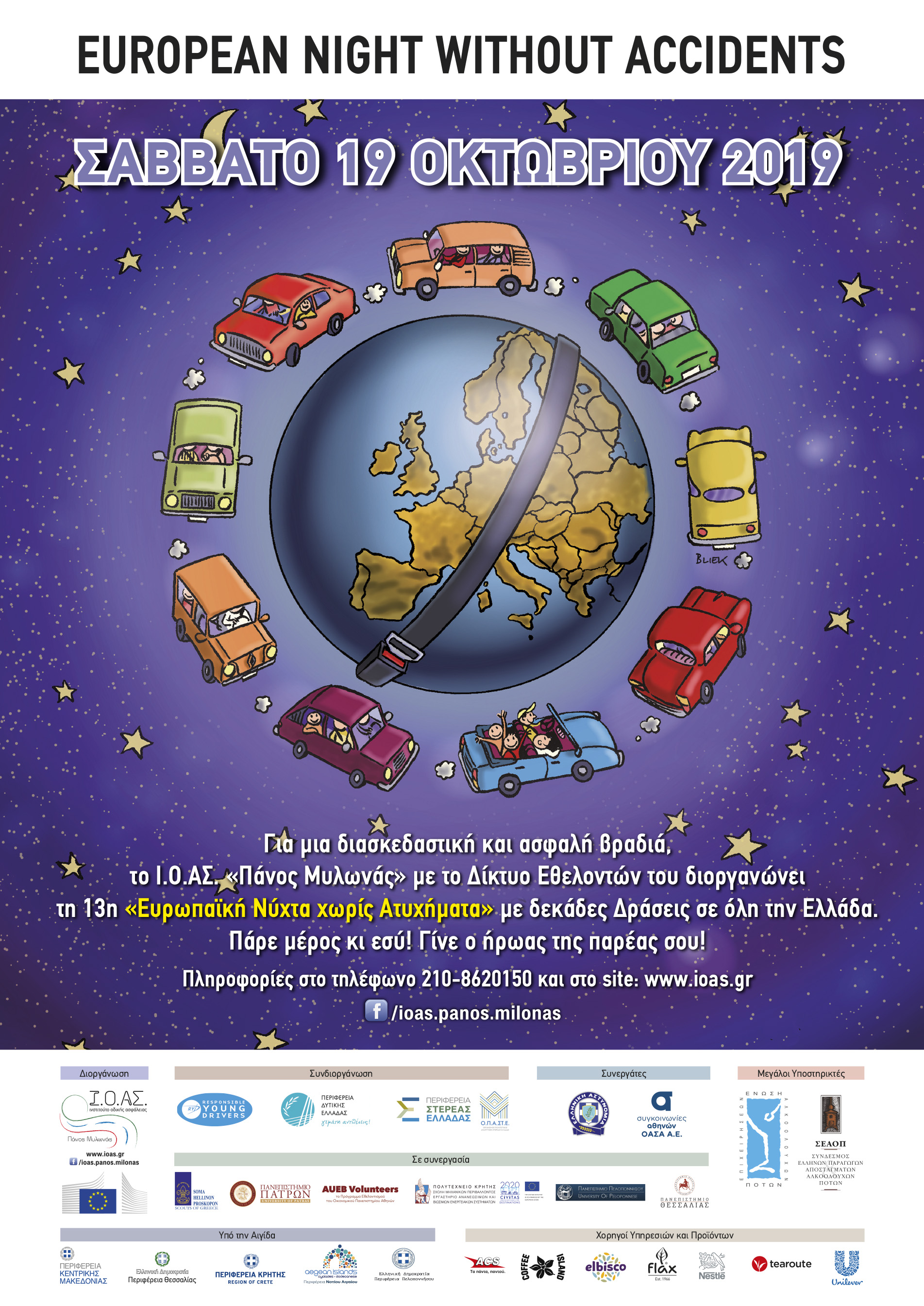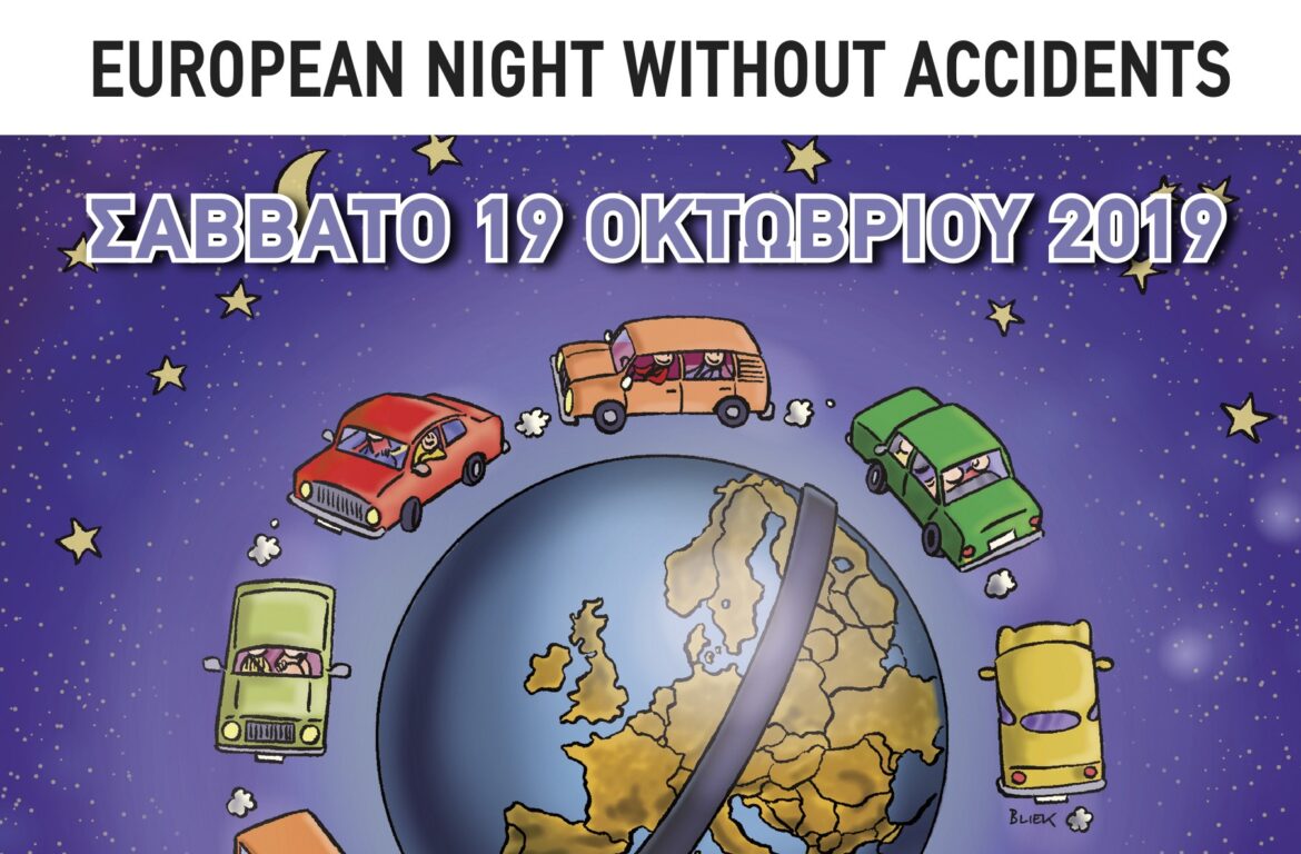 Με κεντρικό μήνυμα «το αλκοόλ και η οδήγηση δεν πάνε μαζί», το Ινστιτούτο Οδικής Ασφάλειας (Ι.Ο.ΑΣ.) «Πάνος Μυλωνάς»διοργανώνει το Σάββατο 19 Οκτωβρίου 2019 τη13η«Ευρωπαϊκή Νύχτα χωρίς Ατυχήματα»σε 32 πόλεις της Ελλάδας.Η ενέργεια πραγματοποιείται, όπως κάθε χρόνο, ταυτόχρονα με τη μεγάλη Πανευρωπαϊκή διοργάνωση, με στόχο την ενημέρωση και ευαισθητοποίηση κοινού και οδηγών για τους κινδύνους της οδήγησης υπό την επήρεια αλκοόλ.
