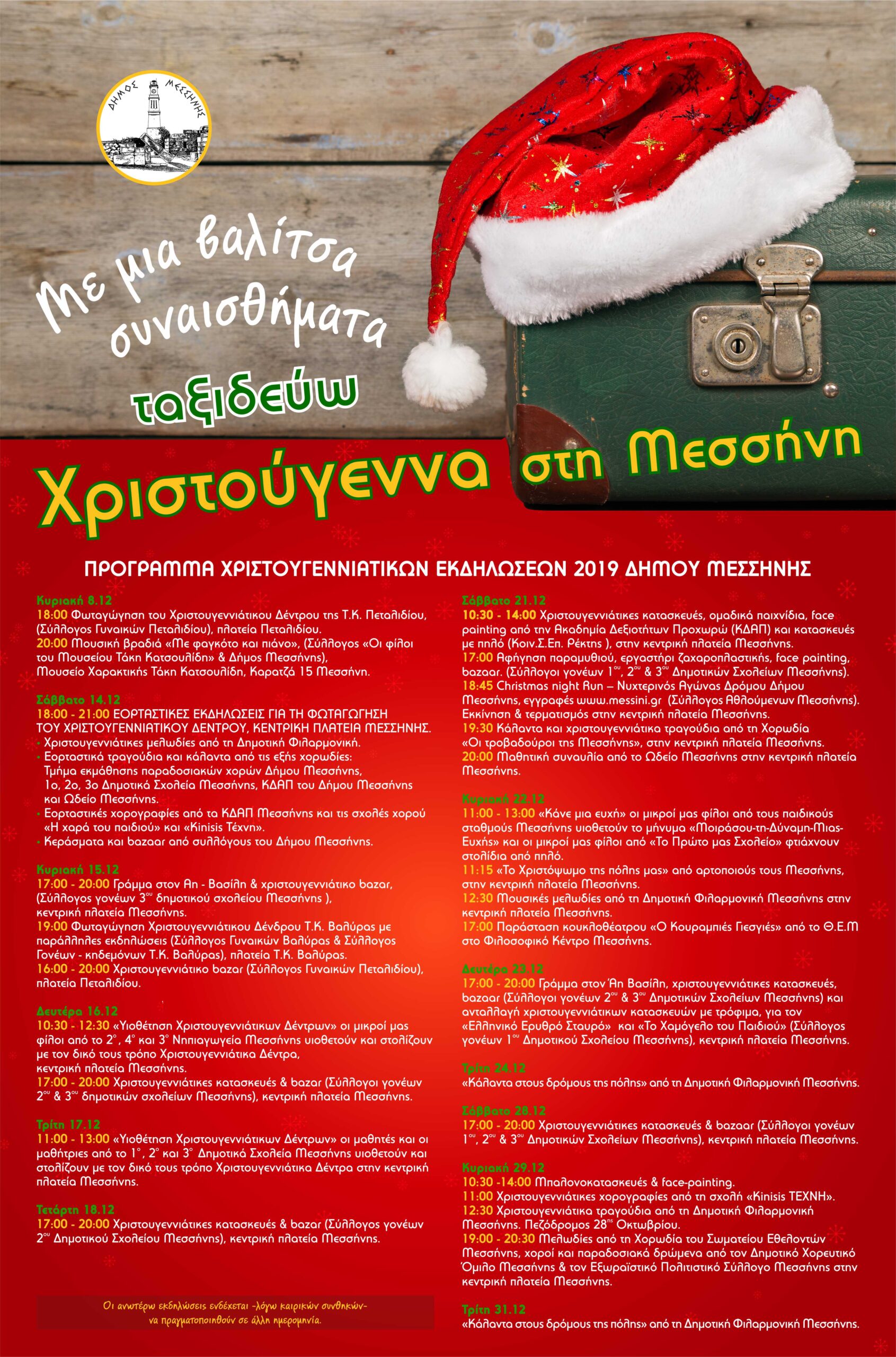 Ακολουθεί το πρόγραμμα των εκδηλώσεων. Να σημειωθεί ότι αρχικά η φωταγώγηση του δέντρου στη Μεσσήνη ήταν προγραμματισμένη για το Σάββατο 14 Δεκεμβρίου. Ωστόσο λόγω του καιρού μετατέθηκε μια ημέρα μετά, την Κυριακή δηλαδή 15 Δεκεμβρίου την ίδια ώρα.