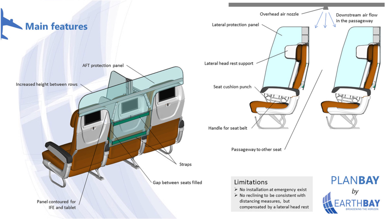 Οι New York Times δημοσίευσαν εικόνες από το φιλόδοξο σχέδιο της εταιρίας EarthBay, η οποία εδρεύει στην Γαλλία και στοχεύει στο να γίνονται τα ταξίδια όσο τον δυνατόν με μεγαλύτερη ασφάλεια για τους επιβάτες. Η εταιρία που ανήκει στον Φλοριάν Μπαρζό, σκέφτηκε μία πιο πρακτική ιδέα για τα καθίσματα στα αεροπλάνα, η οποία θεωρεί πως είναι πιο φτηνή, αλλά και εύκολη στο να χρησιμοποιηθεί. Η εταιρία προτείνει να τοποθετηθεί στα καθίσματα ένα διαχωριστικό, το οποίο ουσιαστικά θα μπορεί να κρατήσει μία ασφαλή απόσταση μεταξύ των ταξιδιωτών.