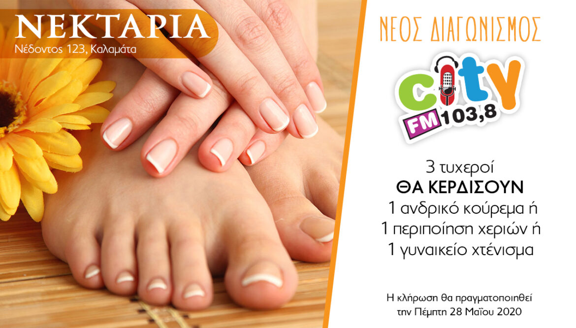 Συντονιστείτε κι εσείς στο City FM 103,8 και όταν σας ζητηθεί τηλεφωνήστε στο 2721063253 και δηλώστε συμμετοχή στο διαγωνισμό για να γνωρίσετε εντελώς δωρεάν τις υπηρεσίες της ΝΕΚΤΑΡΙΑΣ που βρίσκεται Νέδοντος 123 στην Καλαμάτα. Ένα από τα 3 ΔΩΡΑ, μπορεί να γίνει δικό σας στην κλήρωση που θα γίνει την Πέμπτη 28 Μαΐου 2020!