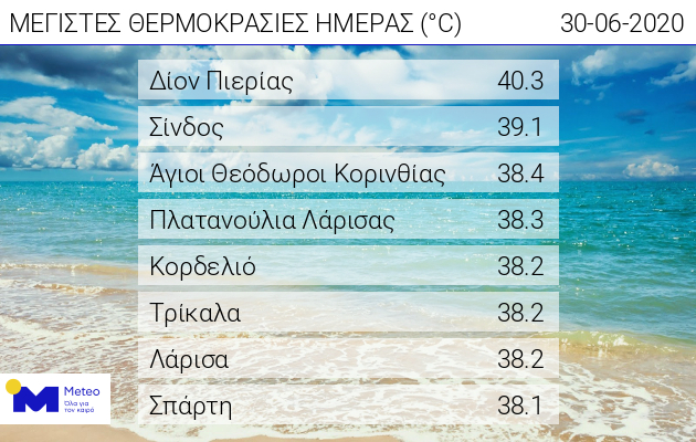 Σύμφωνα με την πρόγνωση της ΕΜΥ, το θερμόμετρο σε όλη την ηπειρωτική Ελλάδα θα πλησιάσει τους 40 βαθμούς, ενώ και στα νησιά το θερμόμετρο θα πιάσει τους 35 βαθμούς Κελσίου. Χθες η θερμοκρασία έγραψε ένα 40αρι, καθώς στο Δίον Πιερίας έφτασε στους 40.3 βαθμούς Κελσίου.