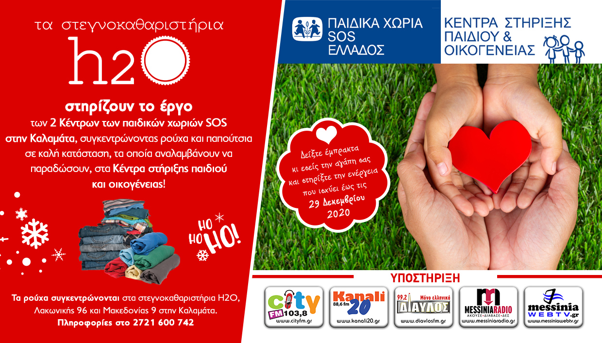 Τα στεγνοκαθαριστήρια H2Ο, στηρίζουν το έργο των 2 Κέντρων των παιδικών χωριών SOS στην Καλαμάτα, συγκεντρώνοντας ρούχα και παπούτσια σε καλή κατάσταση, τα οποία αναλαμβάνουν να καθαρίσουν, να συσκευάσουν και να παραδώσουν, στα Κέντρα στήριξης παιδιού και οικογένειας!