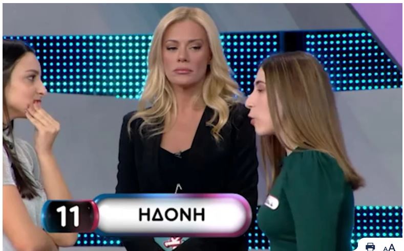 Μια τέτοια παίκτρια «έκαψε» χθες τον εγκέφαλο της Ζέτας Μακρυπούλια καθώς δεν γνώριζε την ετυμολογία της λέξης «ηδονή». Θεωρώντας ότι ηδονή σημαίνει τραγούδι προσπαθούσε να βοηθήσει την συμπαίκτριά της να τη βρει, αλλά μάταια.