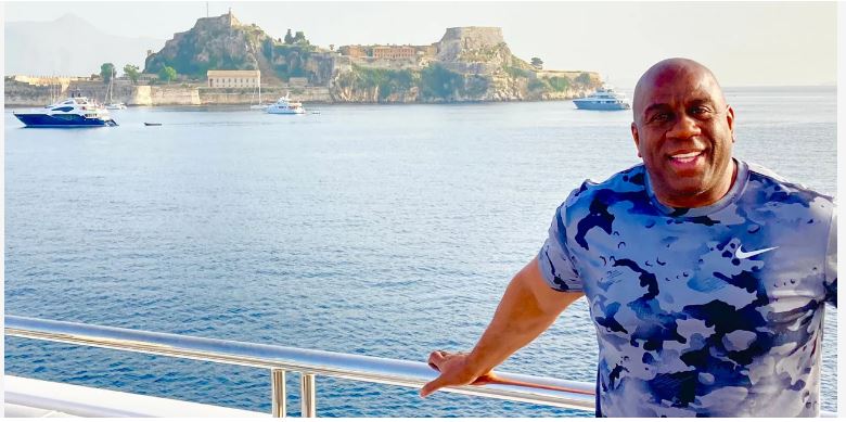 Ο θρύλος του NBA και των Los Angeles Lakers χαλαρώνει στο σκάφος του στην Κέρκυρα, στην πρώτη του ημέρα στην Ελλάδα. Ο Μάτζικ Τζόνσον πόζαρε με φόντο το Παλιό Φρούριο της πόλης, χαμογελώντας και δείχνοντας να περνά καλά.