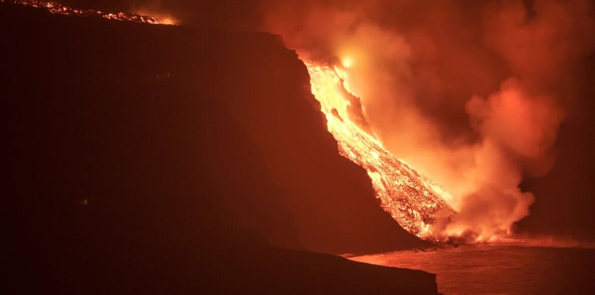Πλάνα που μεταδόθηκαν από περιφερειακό τηλεοπτικό δίκτυο στα Κανάρια νησιά, ισπανικό αρχιπέλαγος στα ανοικτά των βορειοδυτικών ακτών της Αφρικής, εικονίζουν την πυρακτωμένη λάβα να μπαίνει στο νερό, καθώς υψώνεται μεγάλη ποσότητα ατμού…