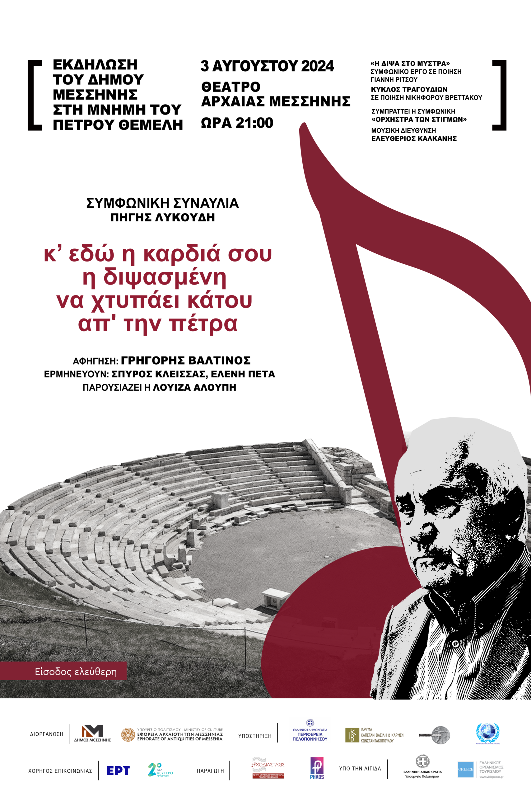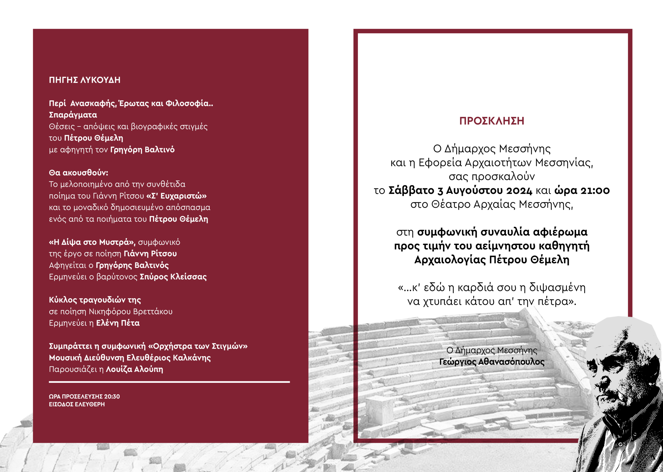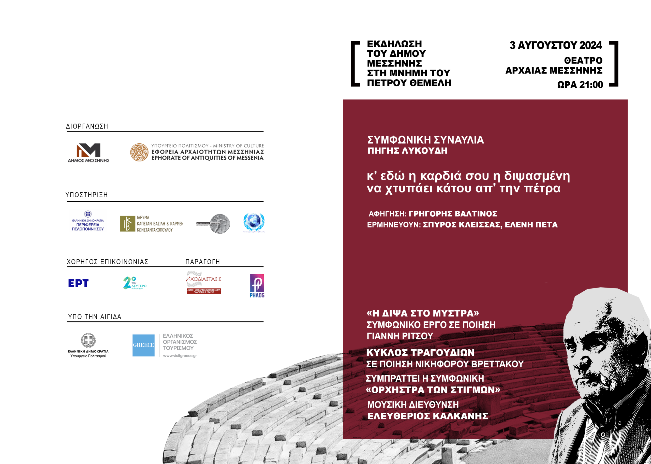 Ο Δήμος Μεσσήνης διοργανώνει στη μνήμη του Πέτρου Θέμελη, του ανθρώπου που με γνώση, όραμα και μεράκι «ανέστησε» την Αρχαία Μεσσήνη, ένα κορυφαίο πολιτιστικό γεγονός, στο αναστηλωμένο Αρχαίο θέατρο. Πραγματοποιεί συμφωνική συναυλία με έργα της βραβευμένης διεθνώς Ελληνίδας συνθέτιδος Πηγής Λυκούδη.